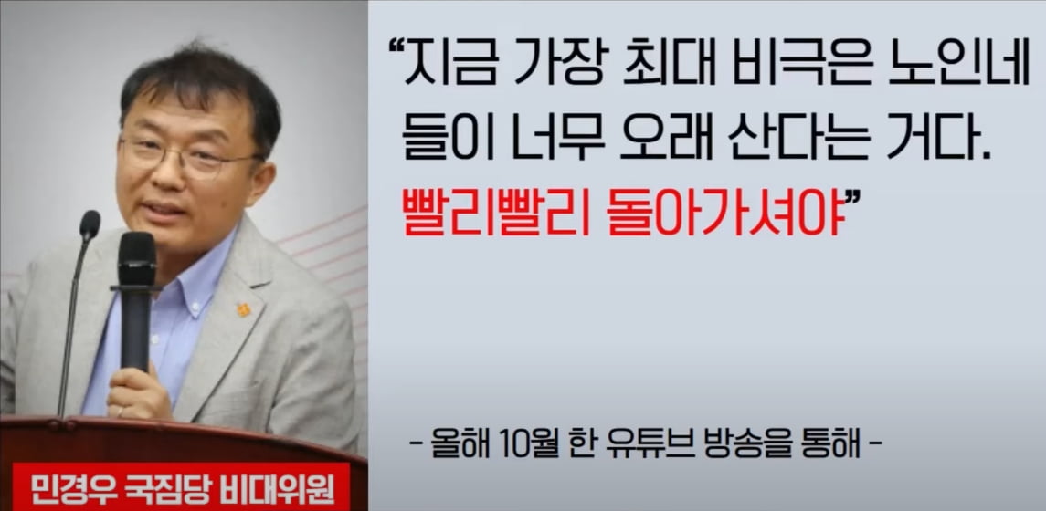 2023년 10월 17일, 민경우는 한 토크콘서트에 참석해 세대 간 갈등에 대한 의견을 밝히면서 “인간과 인간은 토론을 통해서는 (협의가) 잘 안 된다”며 “지금 가장 최대의 비극은 노인네들이 너무 오래 산다는 것이다. 그러니까 빨리빨리 돌아가셔라”라며 노인을 비하하는 발언을 했다.#