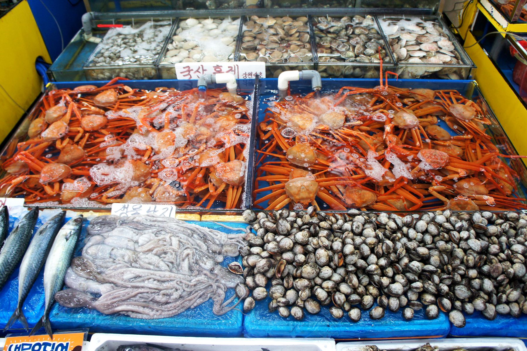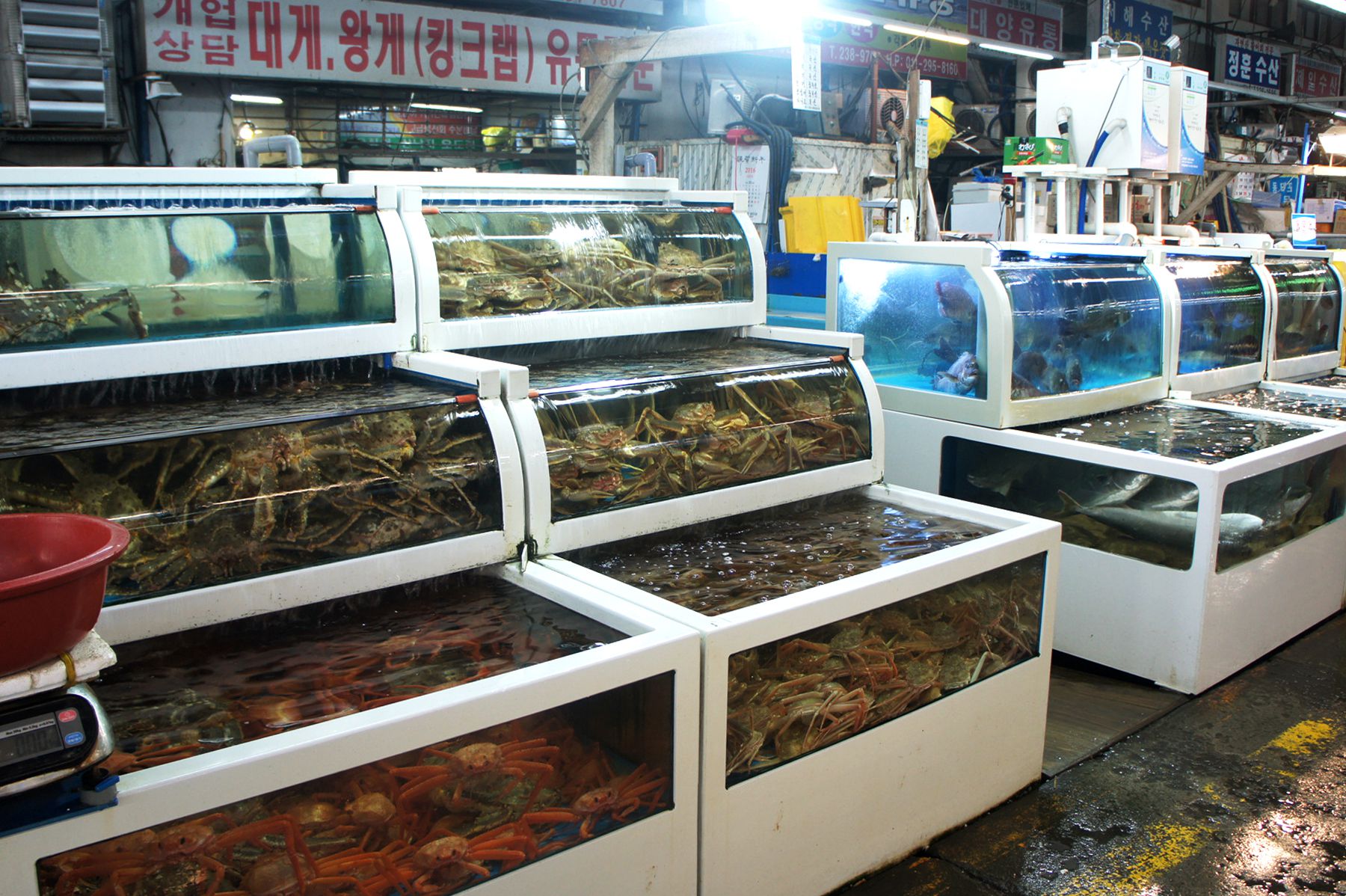 대게, 홍게, 킹크랩, 랍스타까지! 싱싱한 생물들이 수조에 가득합니다.