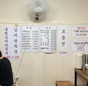메뉴 만두국 만두국 13,000원 김치말이밥 김치말이밥 11,000원 만두전골(중) 만두전골(중) 35,000원 모듬전 모듬전 35,000원
