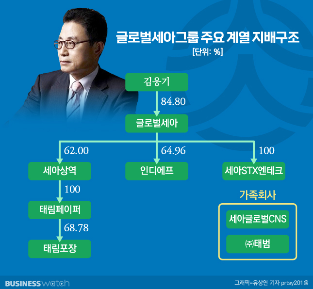 김웅기는 2023년 3월 말 현재 지주회사인 글로벌세아 지분 84.80%(2586만9000주)를 들고 있는 최대주주다. 글로벌세아는 비상장회사다.