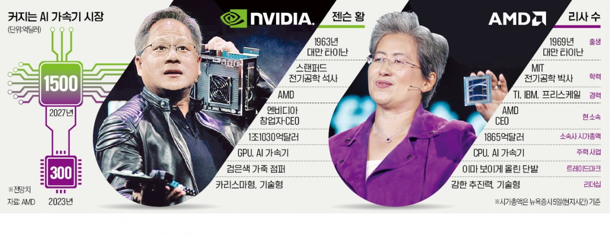 젠슨 황은 엔비디아를 1993년 창업했다. 당시 삼성전자는 글로벌 DRAM(메모리 반도체) 시장 1위를 차지한 떠오르는 태양이었다. 양사를 비교한다는 것 자체가 어불성설이던 시절이다. 세계 반도체 기업 순위에서도 삼성전자는 7위였다. 이랬던 삼성전자와 엔비디아의 관계는 30여 년 만에 완전히 역전됐다. 지난해 매출 기준 세계 반도체 순위로 엔비디아가 3위고, 삼성전자는 4위다.
