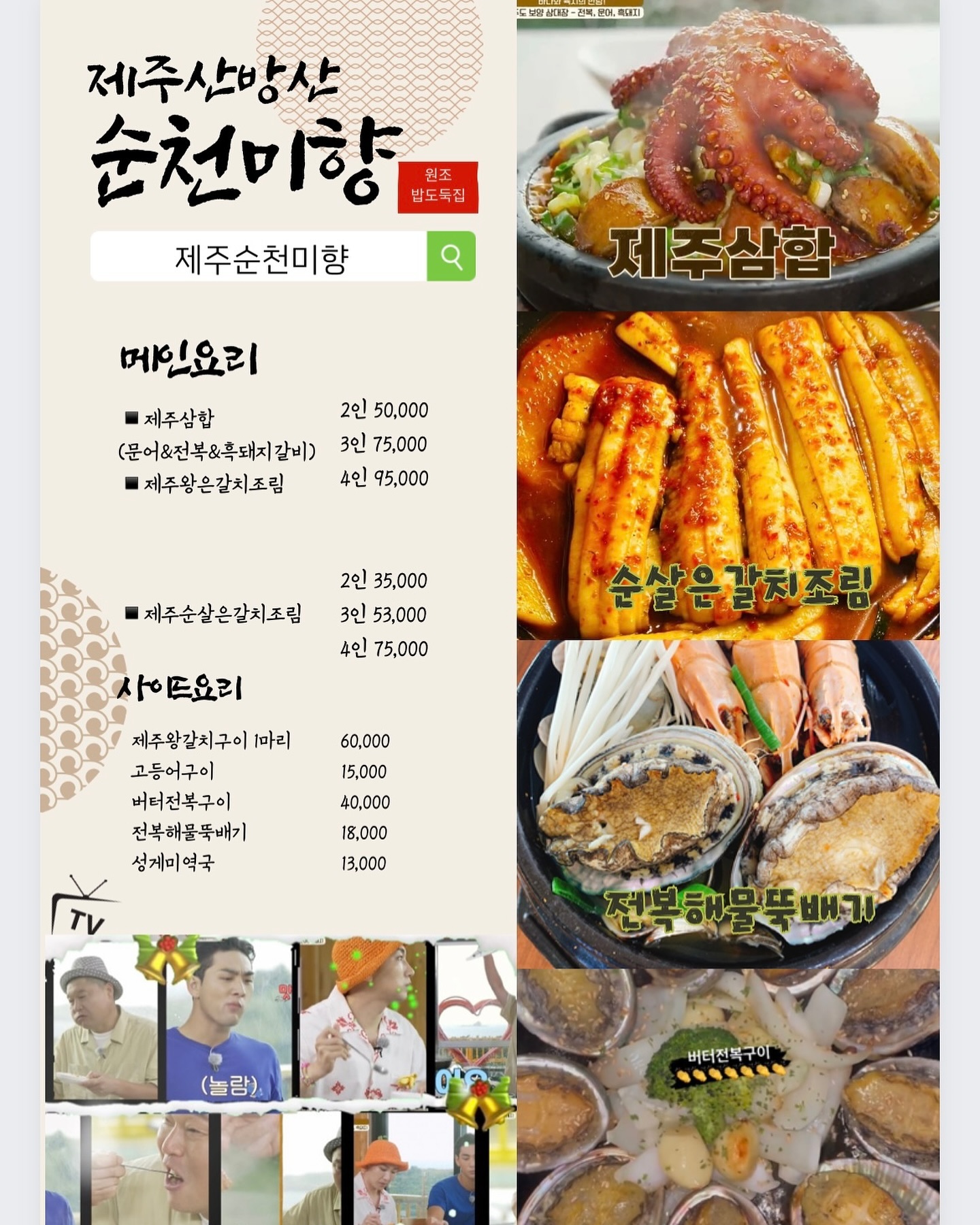 메뉴 제왕(제주)삼합(문어전복흑돼지갈비) 대표 50,000원 제주 왕 은갈치조림 대표 50,000원 순살 은갈치조림 35,000원