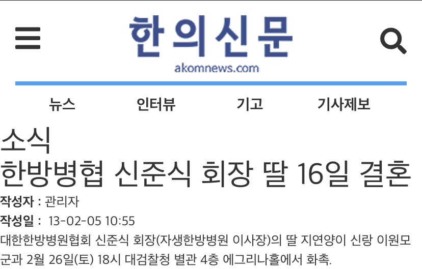 대한한방병원협회 신준식 회장(자생한방병원 이사장)의 딸 지연양이 신랑 이원모 군과 2월 26일(토) 18시 대검찰청 별관 4층 에그리나홀에서 화촉.