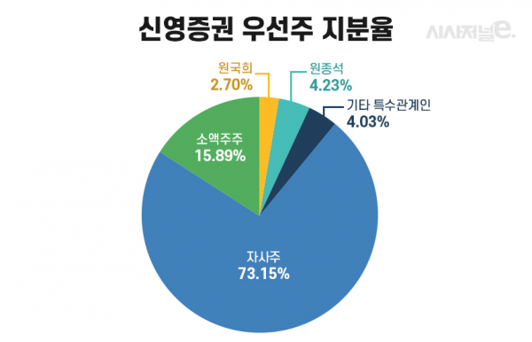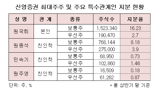 우선주를 보통주로 전환청구 완료후 원종석은 2024년 8월14일 공시 기준 신영증권 보통주 130만8625주(7.96%)를 쥐고 있다. 2023년 9월13일 종가 기준으로 1036억4300만 원어치다.