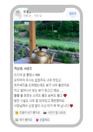 객실 일정선택 인원선택 객실이미지 수10 은방울 95,000~부터120,000원예약 독채, 기준 2인 (최대 4인) 침실 1, 욕실 1 객실이미지 수11 섬초롱 95,000~부터140,000원예약 독채, 기준 2인 (최대 4인) 침실 1, 욕실 1 객실이미지 수11 사랑초 95,000~부터140,000원예약 독채, 기준 2인 (최대 4인) 침실 1, 욕실 1 객실이미지 수11 매화 95,000~부터140,000원예약 독채, 기준 2인 (최대 4인) 침실 1, 욕실 1