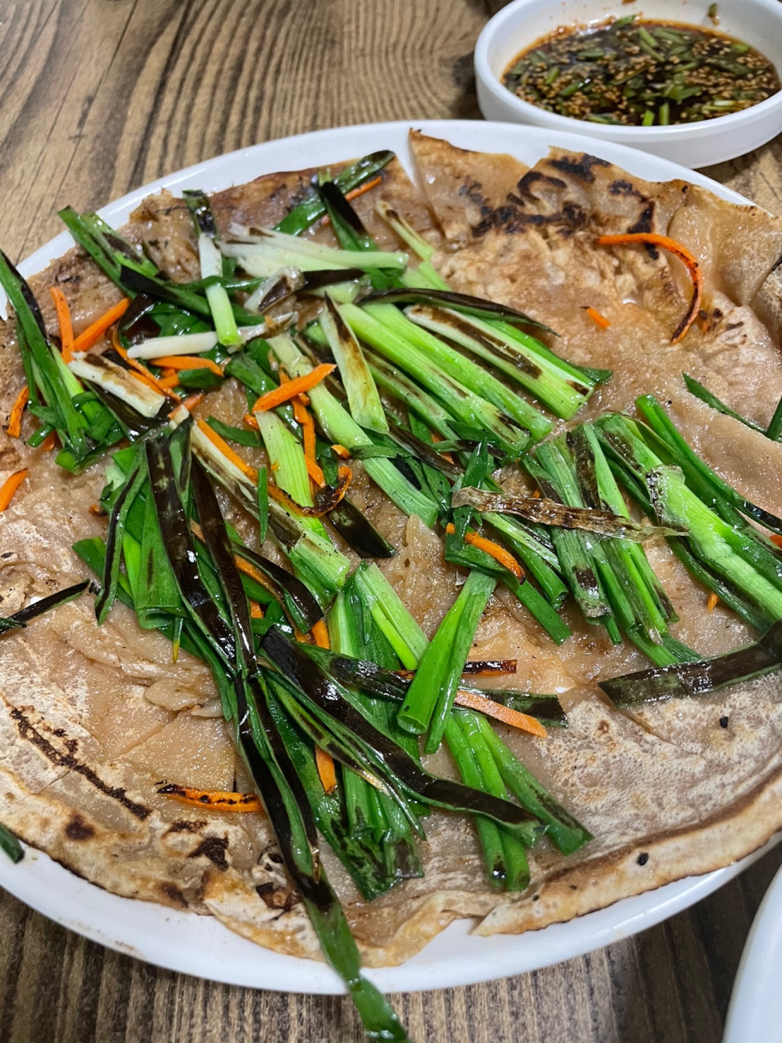 쪽파가 후두둑 올라간 쫄깃한 부침개. 간장 찍어먹어도 맛있고 그냥 먹어도 맛있고 느무 좋습니다.