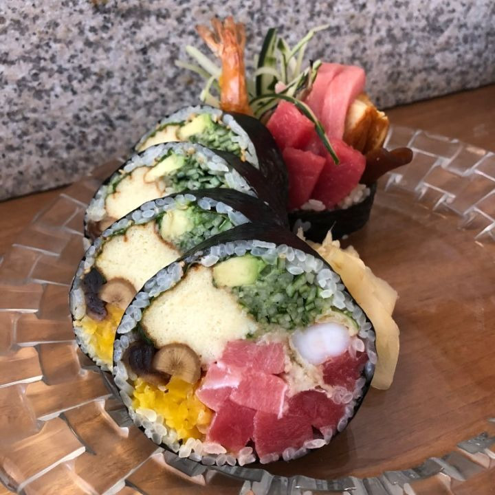 한국식 김밥보다 크게 싸고 안에 회,튀김,아보카도 종류를 많이 넣음