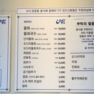 메뉴 물회 18,000원 물회국수 18,000원 회덮밥 18,000원 도다리물회 24,000원
