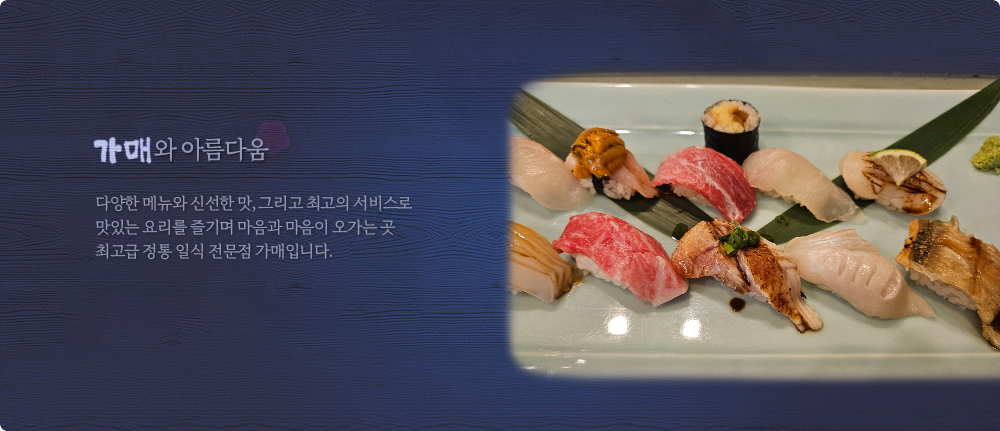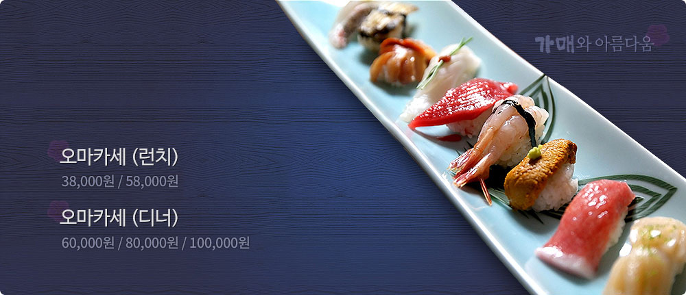 메뉴 남도초밥 & 상추튀김텐동 남도초밥 & 상추튀김텐동 60,000원 남도 생선회 계절 요리(A/B코스) 남도 생선회 계절 요리(A/B코스) 80,000~120,000원 남도 초밥 정식 남도 초밥 정식 80,000원 가매런치정식 가매런치정식 48,000원