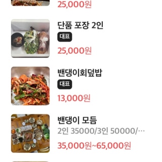 가격 밴댕이회,무침,구이 (2인기준) 각 25,000단품 (각각) 포장 2인 기본 25,000