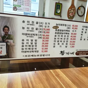메뉴 송이전골 변동 능이전골(대) 70,000원 야생버섯찌개(대) 60,000원 능이회무침(대) 60,000원
