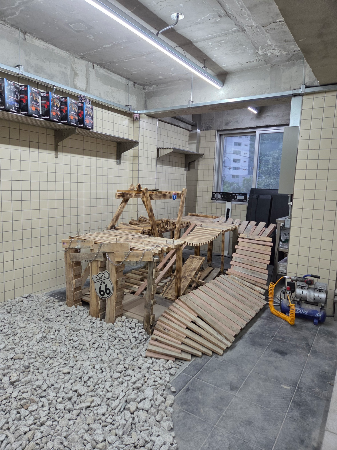 건물 내부에 RC카 부품이 진열되어 있고, 실내 한편엔 직접 정비할 수 있는 테이블도 마련되어 있어요. 전문가들이 정비하는 모습도 구경할 수 있어서 신기했어요. 실내 서킷 트랙에서 RC카 대회도 가끔 열린다니, 다음엔 꼭 일정 맞춰서 보고 싶네요!