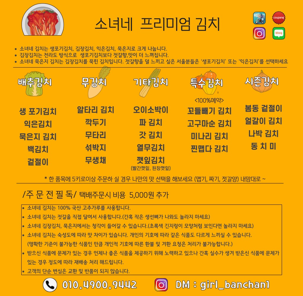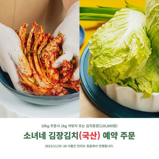 소녀네 수제 명절전 세트 변동 보들 진미채볶음 6,000원 국산 양념깻잎 6,000원 전라도 갓김치 변동 전라도 묵은지김치 변동 찐맵다소녀김치(맵찔사절) 변동 수제오이지무침150g 5,000원 생포기김치 변동 알타리김치 변동 오이소박이(대) 변동