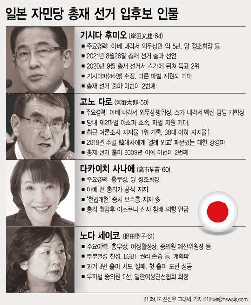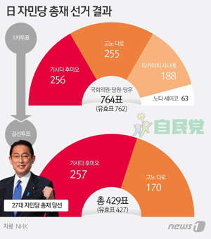 앞서 진행된 1차 투표에선 기시다 전 정조회장이 256표, 고노 담당상 255표, 다카이치 사나에 전 총무상 188표, 노다 세이코 당 간사장 대행이 34표를 기록했다. 과반(382표)을 넘는 후보자가 없어 1·2위인 기시다 전 정조회장과 고노 담당상을 상대로 결선 투표에 나서 기시다 전 정조회장이 승리했습니다.
