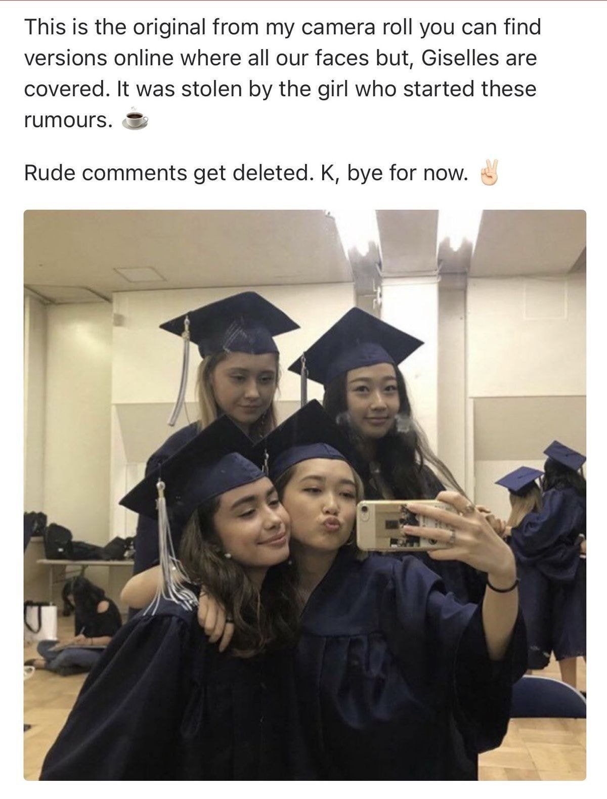 루머 내용은, 2차 가해 소지가 있어서 자세히는 안적지만 퍼트린 곳은 인스티즈 임. 지젤이 다닌 중,고등학교는 '도쿄 국제학교' 였고 나중에 세이신 여학교 중에 도쿄 소재의 '세이신 여자...