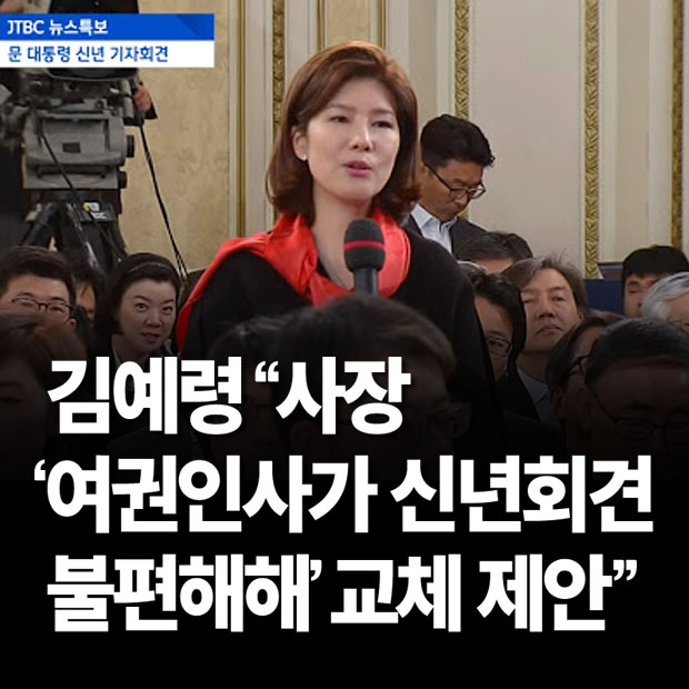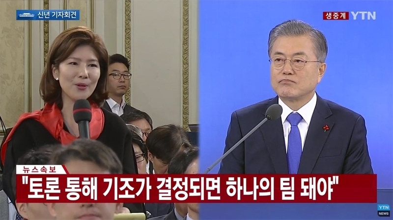▲ 김예령 당시 경기방송 청와대 출입기자(왼쪽)가 지난해 신년기자회견에서 문재인 대통령에게 질문하는 모습. 사진=YTN 화면 갈무리
