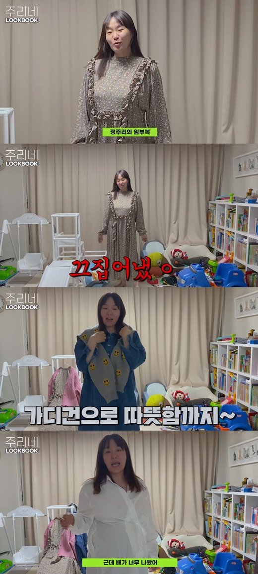 12일 정주리가 운영하는 유튜브 채널 '정주리'에는 '아이 4명 엄마 정주리의 임부복 룩북 | 근데 이거 룩북 맞아..? | 임산부 데일리코디 | 임부복 LOOKBOOK'이라는 제목의 영상이 게재됐습니다.