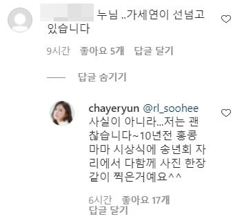 8일 한 네티즌은 연예부 기자 출신 유튜버 김용호의 폭로에 "'가세연'이 선 넘고 있다"는 댓글을 남겼다. 이에 차예련은 "사실이 아니라 나는 괜찮다. 10년 전 홍콩 마마 시상식 송년회 자리에서 다 함께 사진 한장 같이 찍은 것"이라고 답글을 달았습니다.