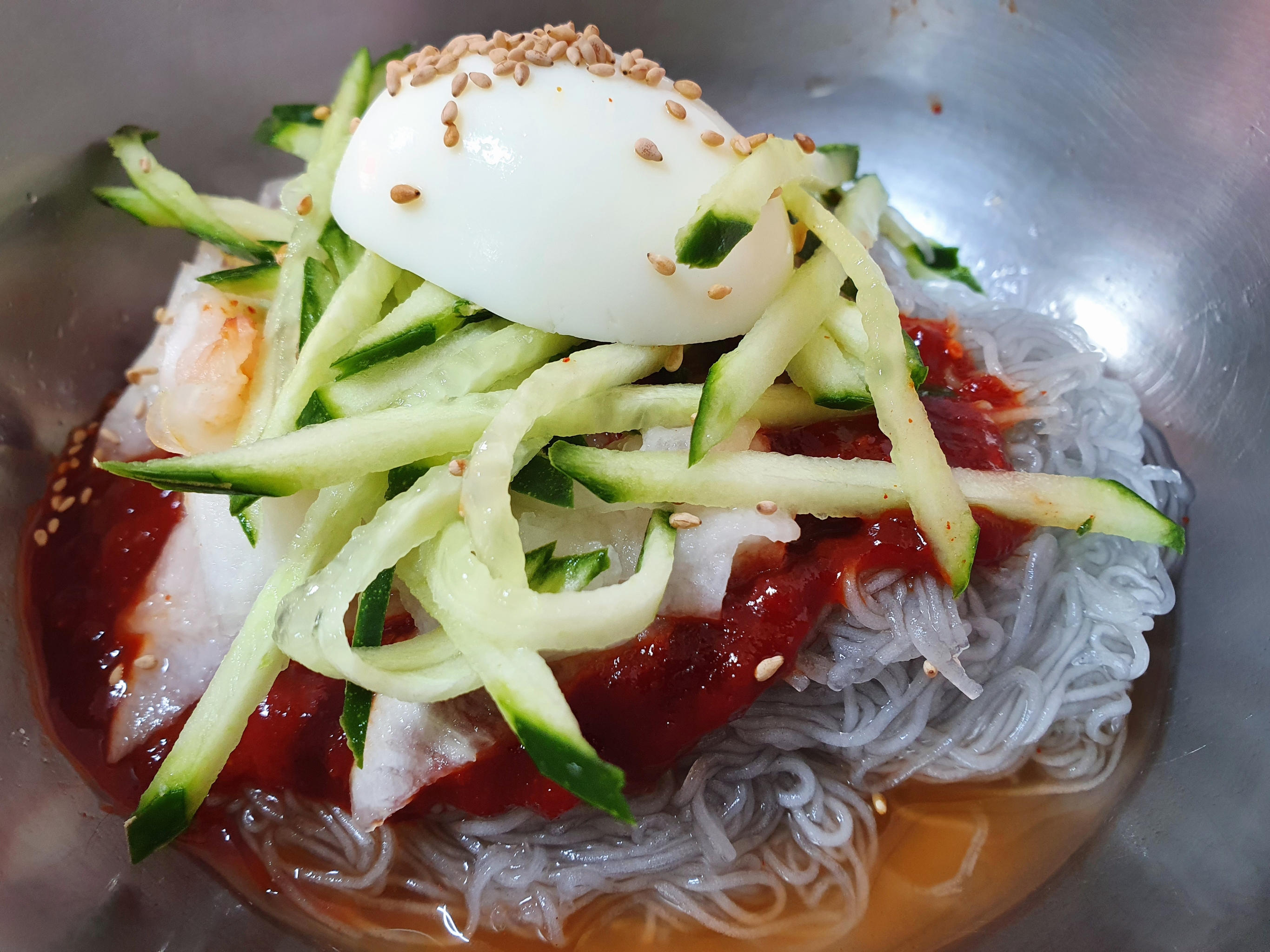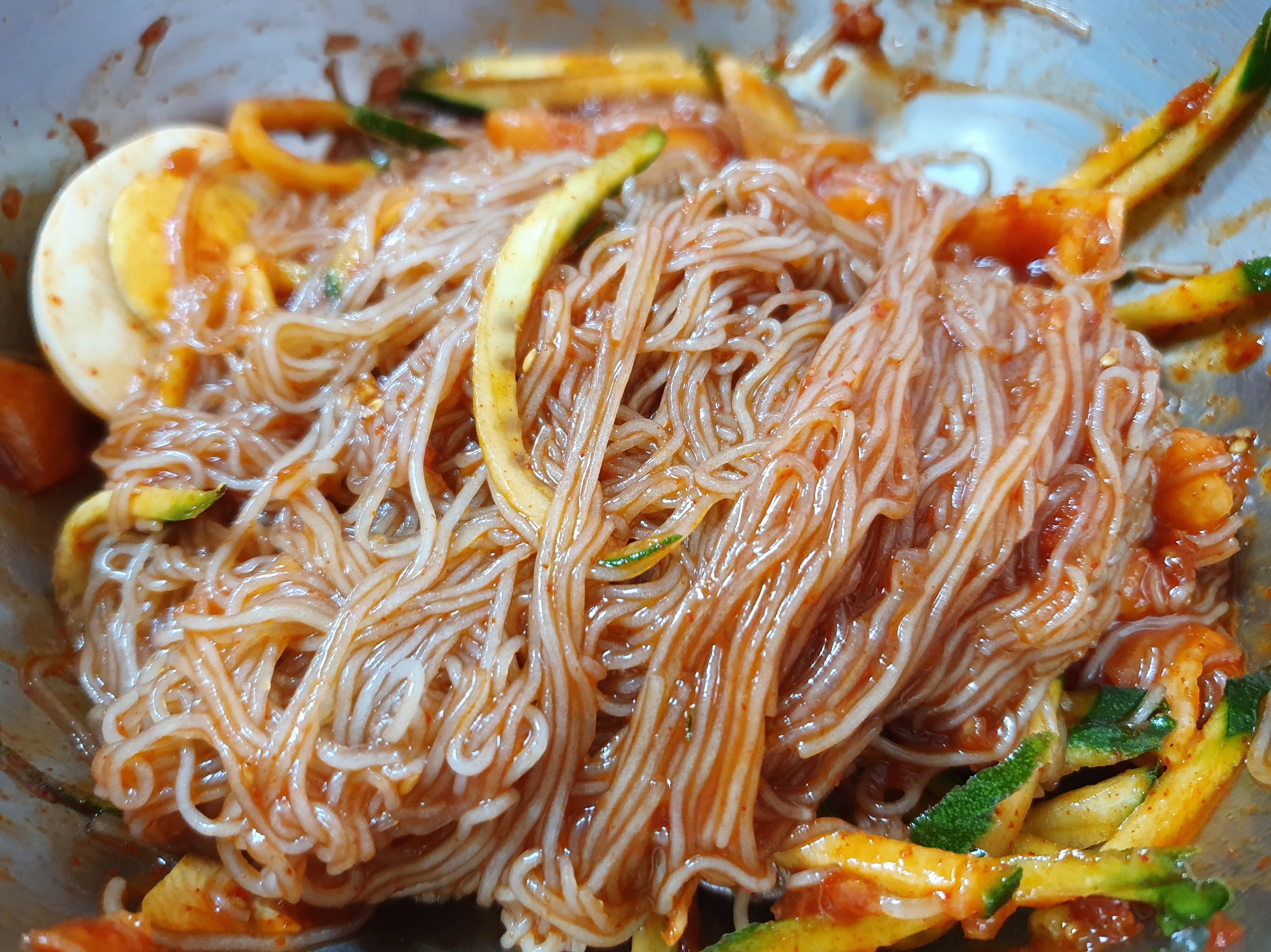 적당히 기다려 갓 뽑아진 냉면이 냉육수와 같이 나왔고 냉면을 슥 보니 보통 정도 볼륨의 냉면은 비주얼로는 제일 함흥냉면 느낌에 가까운데 원래 함흥냉면을 먹을 때 식초와 설탕을 잘 뿌려서 먹는데 설탕도 두 티스푼 정도 뿌리고 초고추장 냄새의 비빔양념을 잘 비빈 후 맛을 보니 냄새와 비슷한 특별하지 않은 초고추장 느낌의 비빔양념 맛에 금방 실망하게 되고 면도 비주얼은 함흥냉면의 것이었지만 더 부들해서 마치 스키야키에 들어가는 일본 당면인 하루사메가 떠올라 다시 한 번 실망하게 됨.