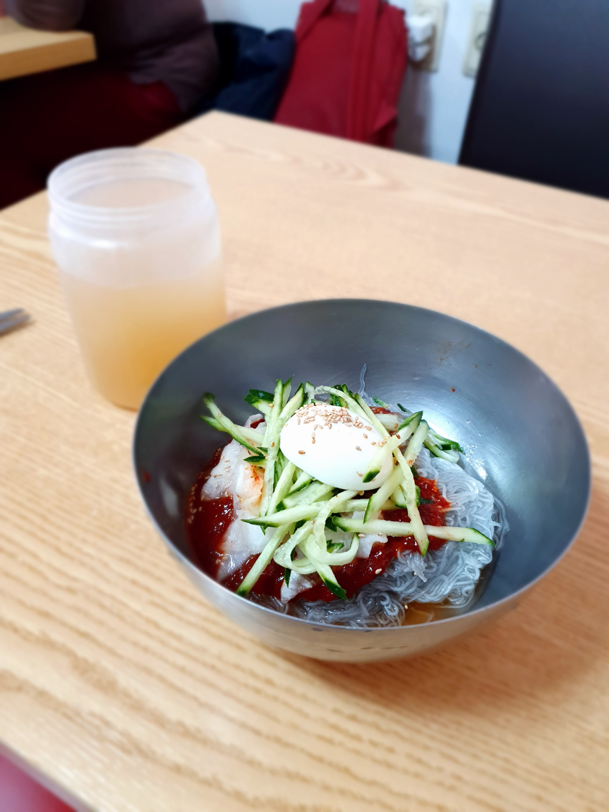 셀프인 온육수와 찬물을 따라 자리에 앉아 온육수를 맛을 보니 앞의 두 가게와는 다른 매콤한 냉면을 내놓는 B급 냉면가게에서 기대하는 MSG느낌 육수지만 그렇다고 매력적으로 자극적이지도 않아 기대보단 별로였고 기다리면서 보니 여사장님 혼자서 면도 뽑으시고 서빙도 하셔서 바쁘신데 자가제면이어선지 지난번에 들렀었던 낙원동 유진식당도 떠오름.
