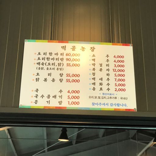 메뉴는 많지 않아요. 성인 4명이서 오리 1마리 (₩60,000) 이면 충분해요. 오리 냄새도 안나고 또 숯불에다가 구워먹는 재미가 있어요. 냉국수가 없는 건 아쉽지만.. 이열치열의 느낌으로 따뜻한 국수도 깔끔하니 맛나요.