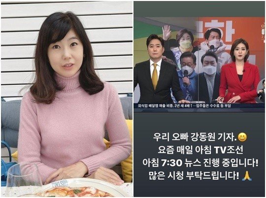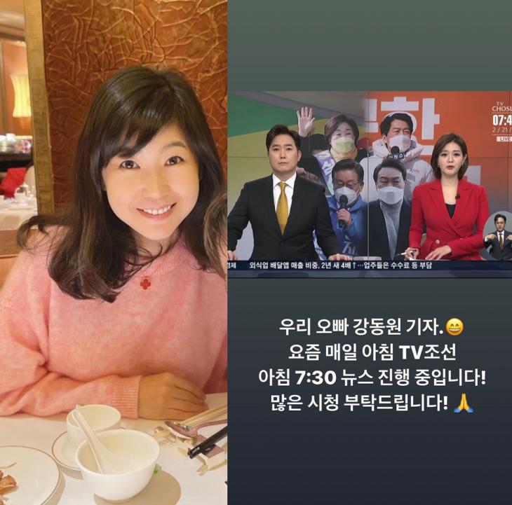 21일 오전 강수정은 자신의 인스타스토리에 "우리 오빠 강동원 기자. 요즘 매일 아침 TV조선 7:30 뉴스 진행 중입니다. 많은 시청 부탁드립니다"라는 글과 함께 뉴스 화면 캡처를 공유했다.