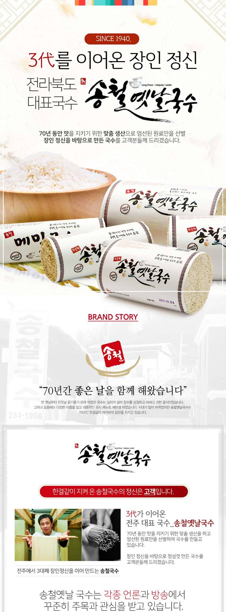 전주에서 가장 오래된 국수공장으로 ‘천년전주기네스’, ‘전라북도대표관광기념품100선’에 선정되어 방송3사는 물론 여러 언론사에 소개될 만큼 전국에서 여러 고객이 찾아주고 있습니다. 전주시내에는 무려 20여 곳의 국수공장이 있습니다만 현재까지 전주에서 그 명맥을 잇는 곳은 70년 전통의 저희 공장이 유일합니다. 송철국수는 3대를 이어가는 국수공장인 만큼 단순히 국수를 생산하는 공장이 아닌 고객들에게 추억을 함께 드릴 수 있는 공간입니다. 3대째 공장을 운영한 만큼 공장을 찾아와주시는 고객 또한 대를 이어 오시는 손님들이 많으며 한옥마을과 인접해 있어 많은 관광객 또한 공장 견학을 오시곤 합니다. 전라북도를 대표하는 ‘송철옛날국수’ 맛의 포인트는 건조과정에 있습니다. 저희 공장에서는 대형 국수공장과 달리 국수를 선풍기 바람으로 건조합니다. 말리고, 쉬고, 말리고, 쉬고를 3번 반복해 쫄깃하고 가루냄새가 없는 부드러운 면발의 식감을 만들어 냅니다. 정성을 다해 만든 국수를 전북도민이 오래오래 기억할 수 있도록 앞으로도 최선을 다해 만들 수 있도록 노력하겠습니다.