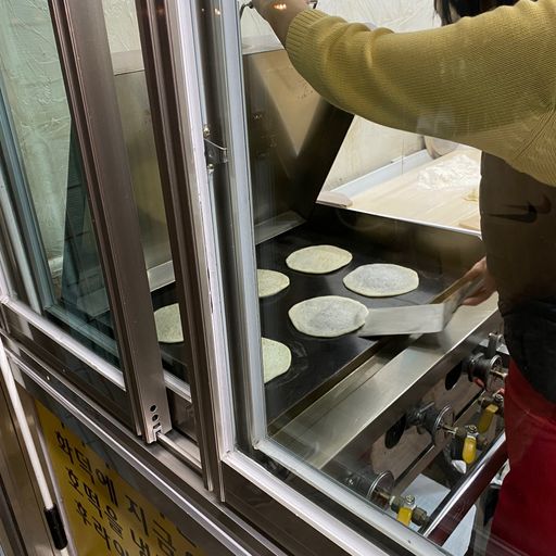 화덕 호떡이고 주문과 동시에 만들어주신다고 하길래 굽는 모습이 궁금했는데 호떡을 굽는 곳이 내가 아는 화덕처럼 생기진 않았다. 납작한 반죽을 철판에 눌러줬다 열면 어느새 동그랗게 부풀어 있는 게 신기했다.