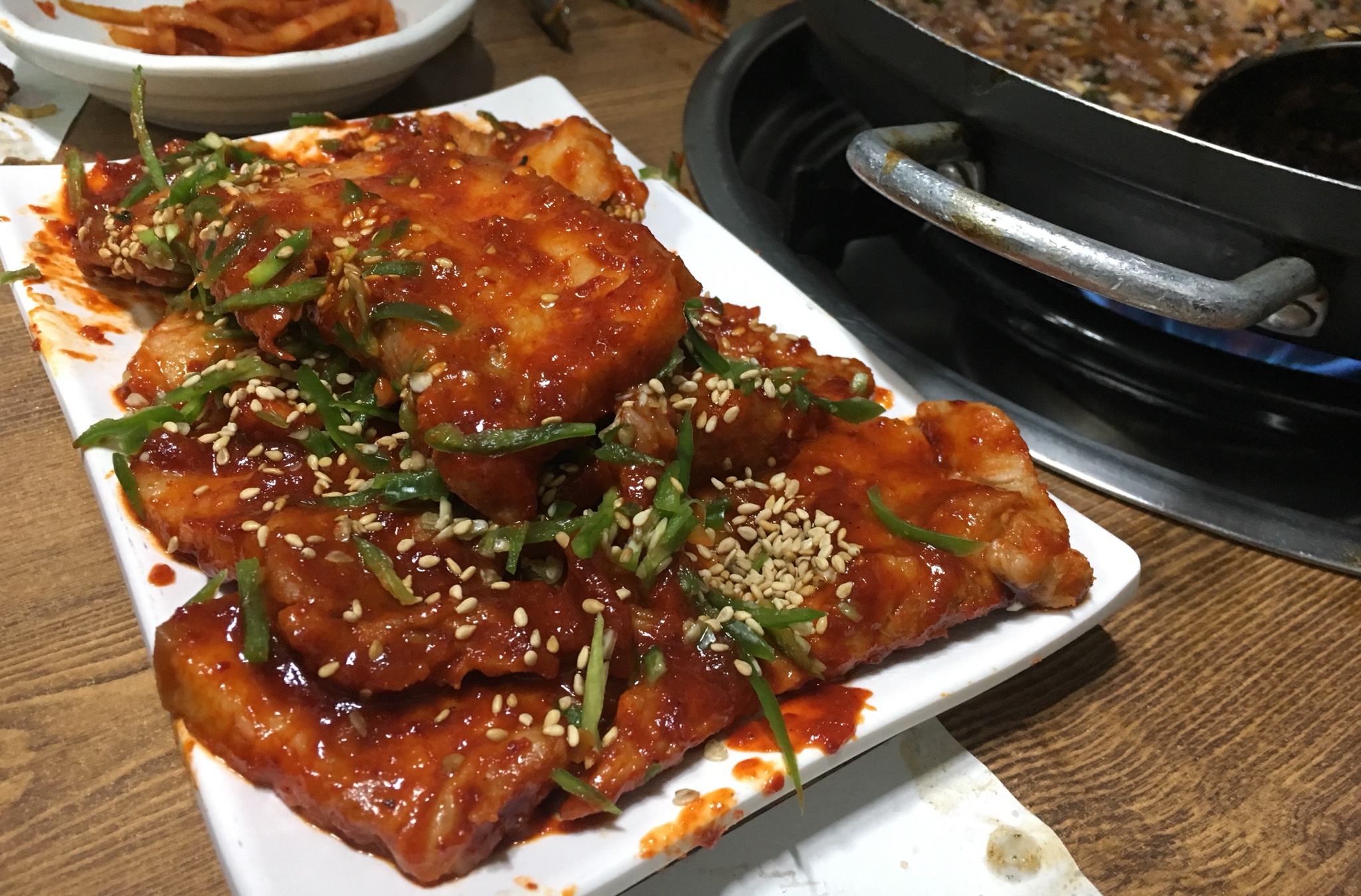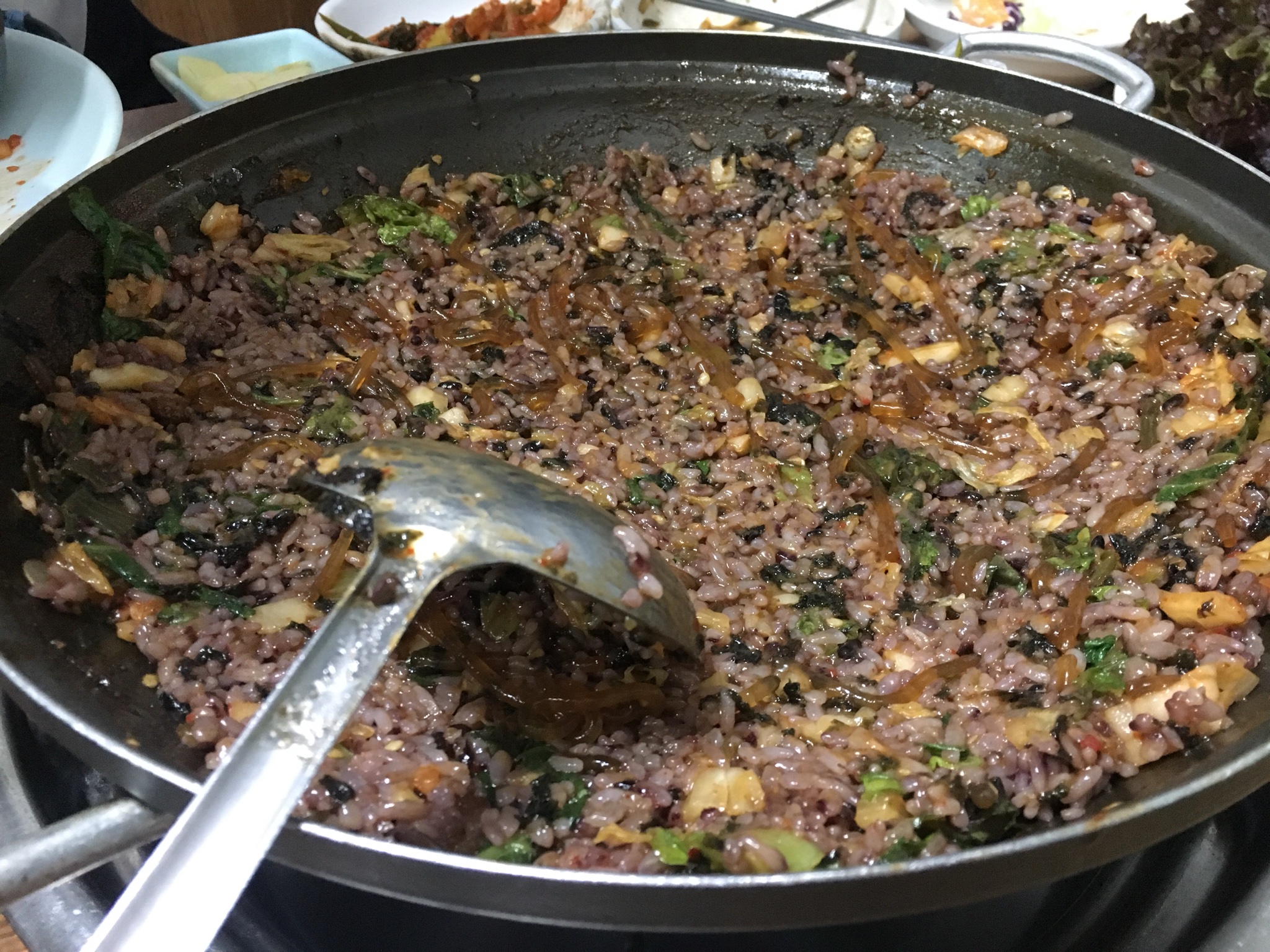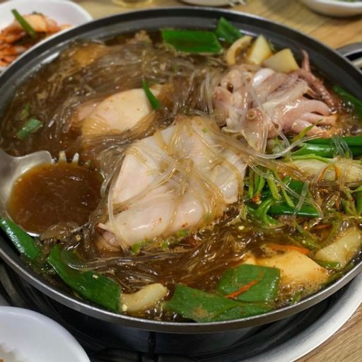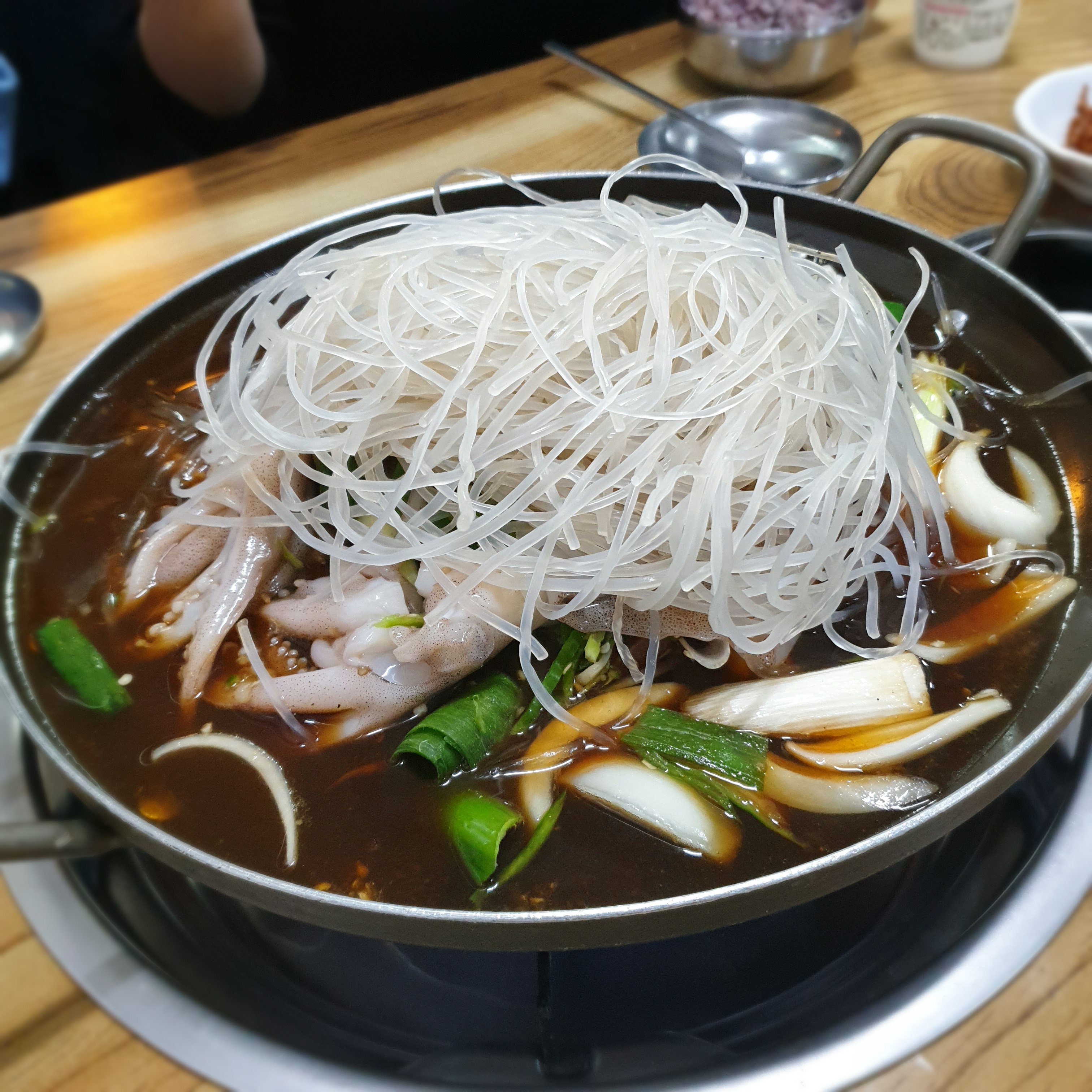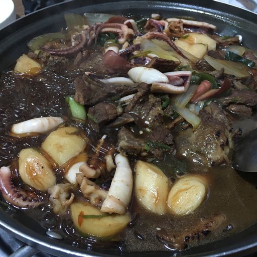 간장베이스에 오징어 통째로 한마리, 당면사리 그리고 바닥에 깔려있는 갈비까지! 얇게 썬 청양고추로 자칫 너무 달기만할뻔했던 맛을 매콤함으로 잡았다. 간장베이스에 매콤한 맛이 안동찜닭느낌도 있으나 처음먹어보는 맛이라는 표현이 적절할 듯하다. .
