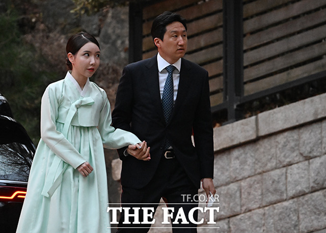 고 정주영 현대그룹 명예회장의 22주기를 맞아 범현대가(家)가 20일 오후 서울 종로구 정 명예회장의 옛 청운동 자택에 모인 가운데 정기선 HD사장과 부인 정현선 씨가 발길을 옮기고 있습니다.