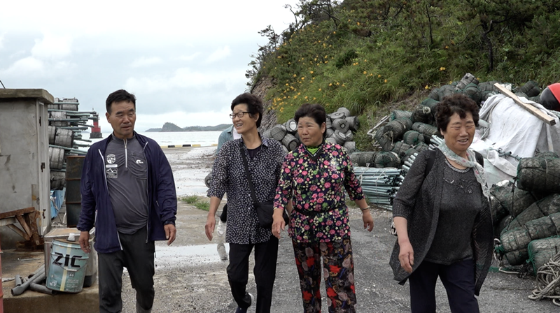 만숙 씨가 잡아 온 물고기와 물물교환을 하기 위해 기다리는 하의도 주민들이다.
