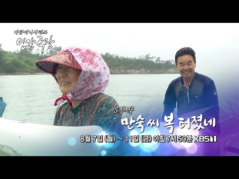 전남 신안 신도에는 주민들의 든든한 이장 이만숙 씨가 살고 있다. 어복만큼은 타고났다는 그가 매일 아침 민어잡이에 나서자 거대한 민어가 하나둘씩 그물을 타고 올라온다. 만숙 씨의 누나들은 갓 잡은 민어로 여름 보양식 한 상을 차려낸다. 직접 잡은 해산물을 주민들과 나누고 이웃 섬 주민들과 물물교환도 하며 슬기로운 섬살이 중. 신도를 더욱더 살기 좋은 섬으로 만들기 위한 섬마을 이장, 이만숙 씨의 하루는 늘 활기차다.