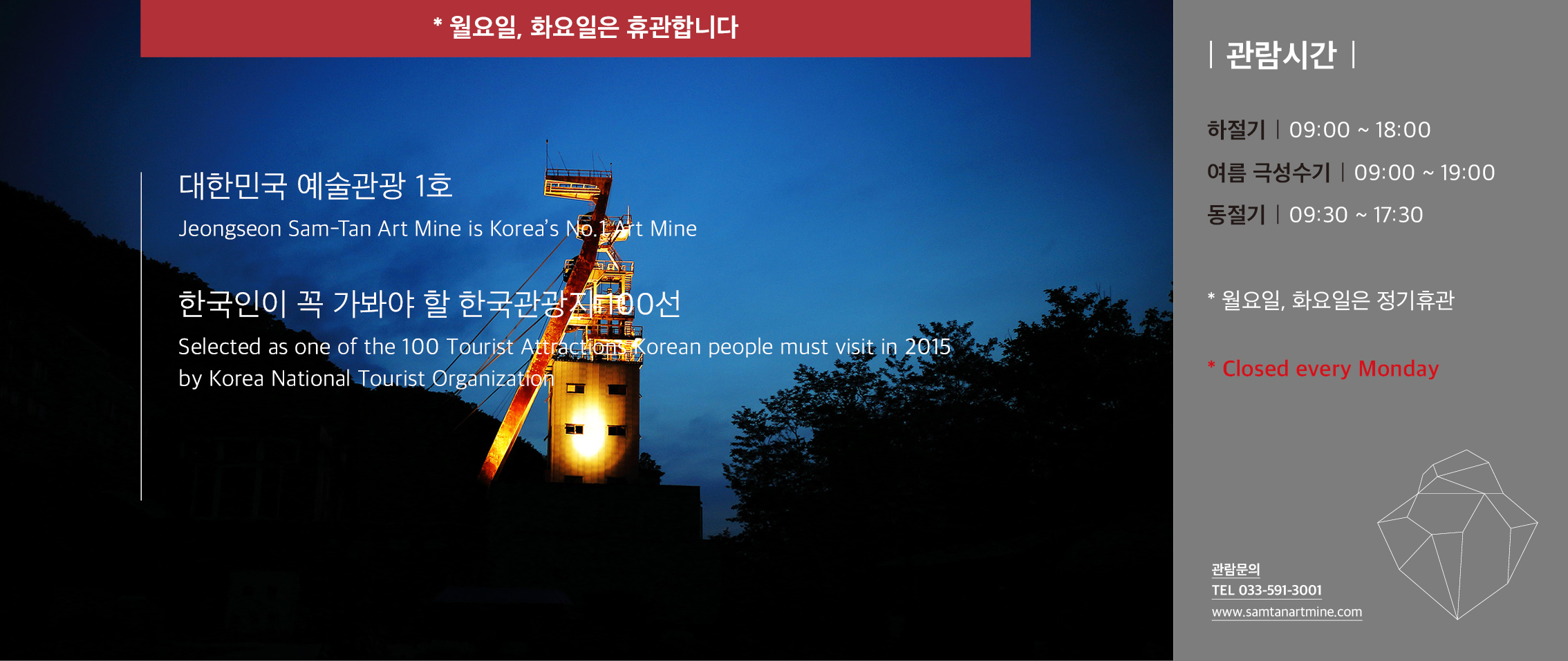 만5세 미만은 무료입장입니다. 삼탄아트마인 (월,화 휴무입니다.) 문화체육관광부와 한국관 광공사가 선정한 2015 한국인이 꼭 가봐야 할 '한국관광 100선' 석탄은 2억년은 지나야 만 들어집니다. 광부들은 그래서 2억년의 시간을 캐는 사람들입니다.