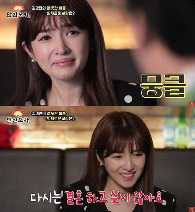 아나운서 출신 방송인 김경란이 다시는 결혼 하고 싶지 않다고 밝혔습니다.