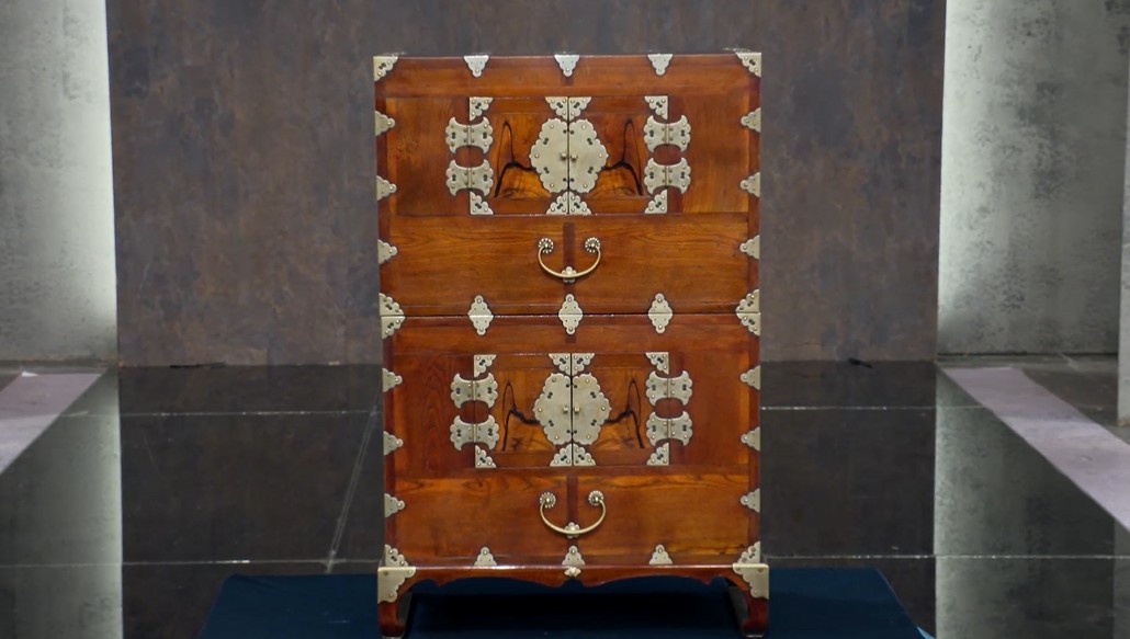 나뭇결의 자연미와 화려한 장석의 조화가 어우러진 고가구가 시선을 사로잡습니다.