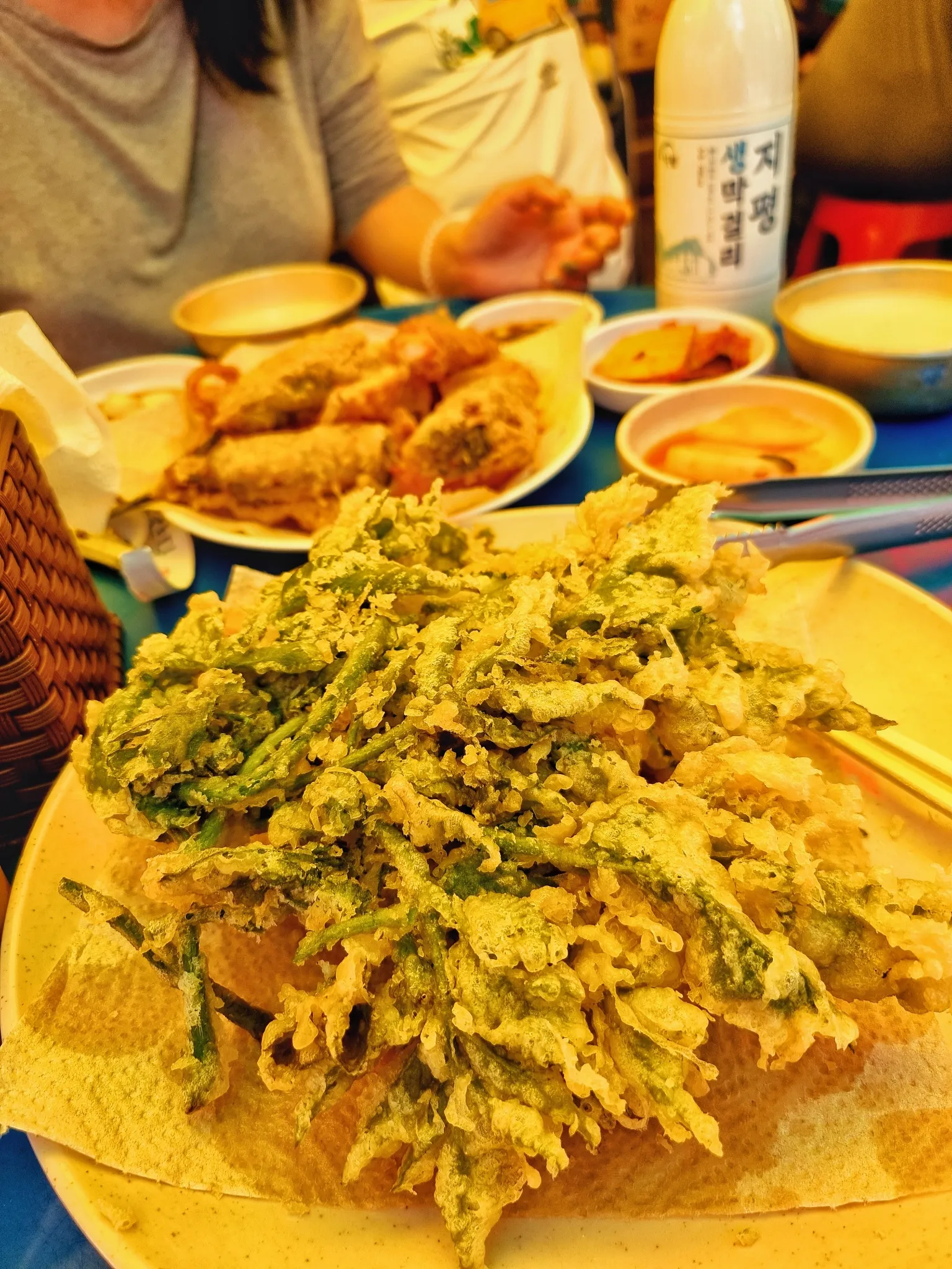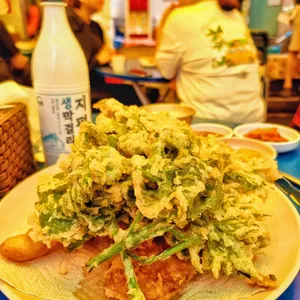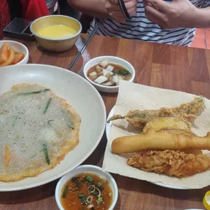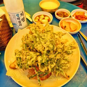술모임, 데이트 모듬튀김, 장칼국수, 녹두전 메밀/녹두/감자전 은어튀김, 산나물튀김, 메밀전, 감자전, 묵사발